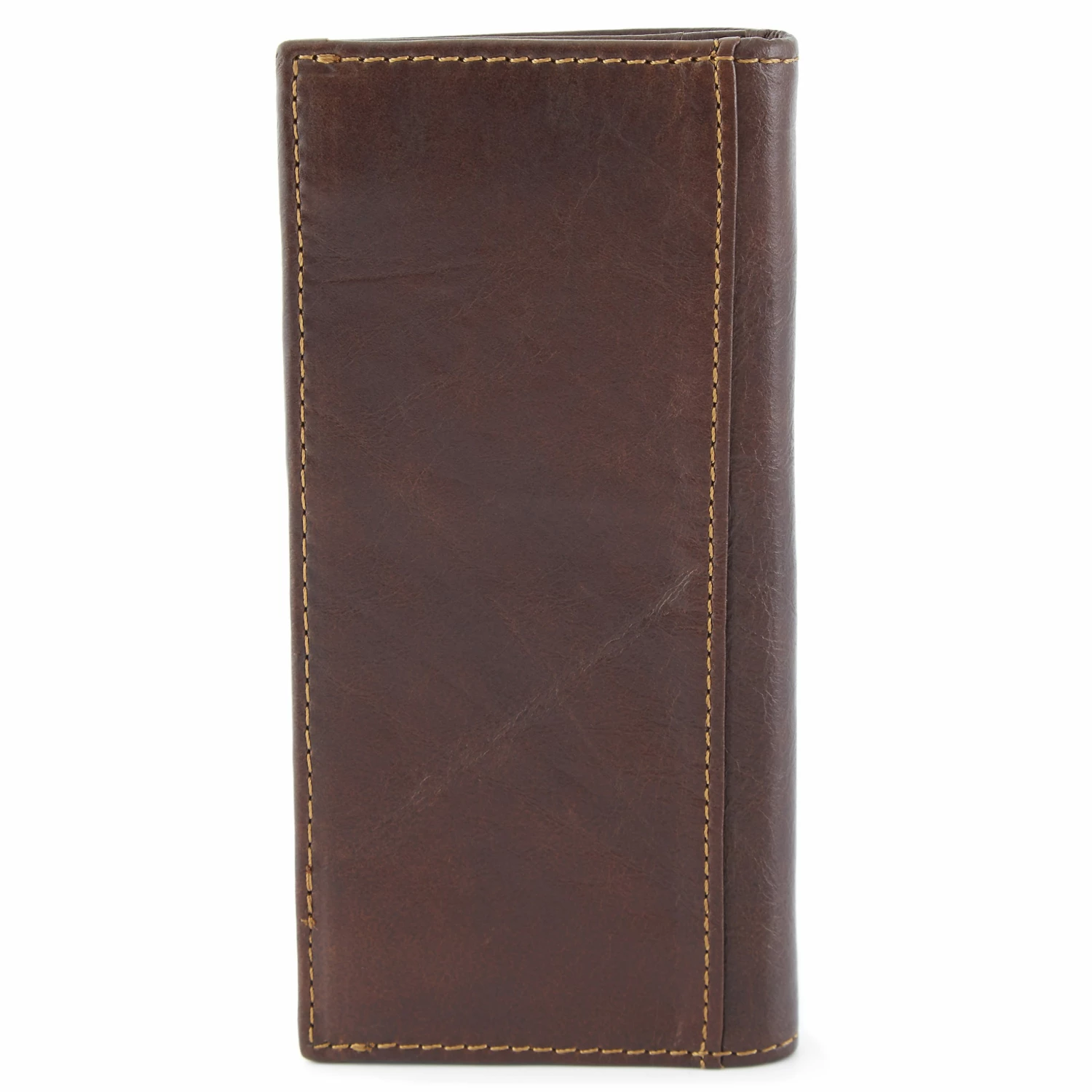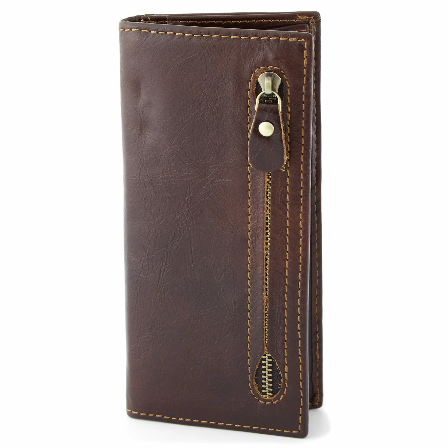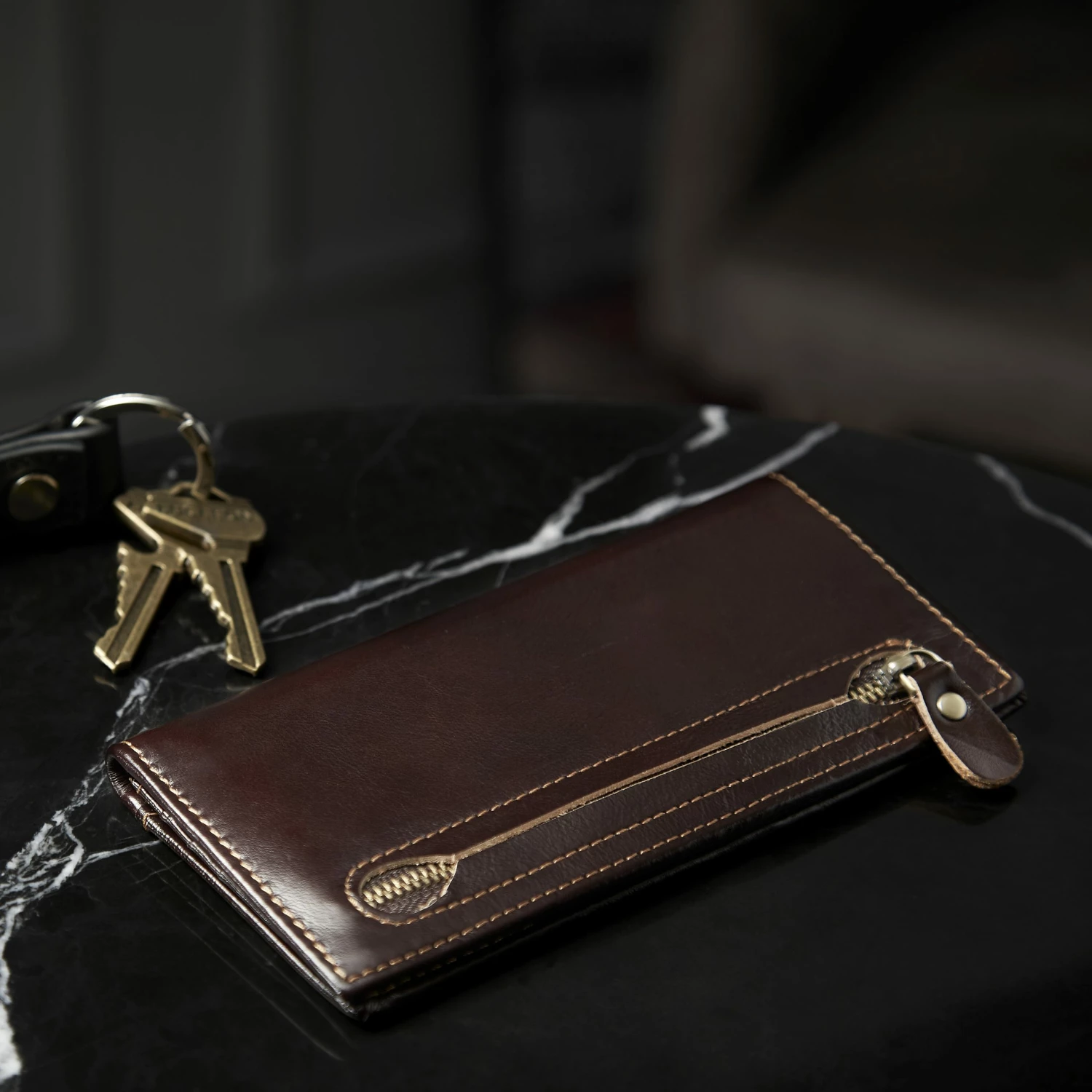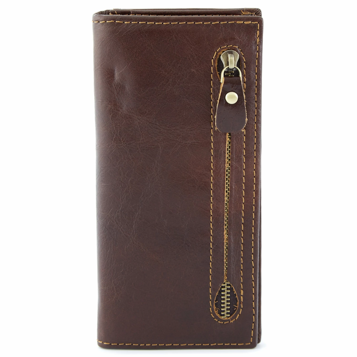 Un joli portefeuille en cuir véritable couleur châtaigne au design compact et avec protection RFID. Ce portefeuille protégera le vol des données personnelles de vos cartes pour une sécurité maximale.