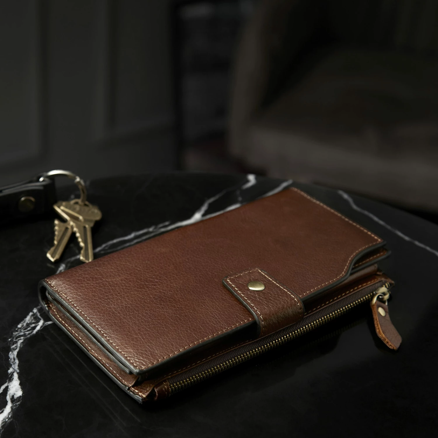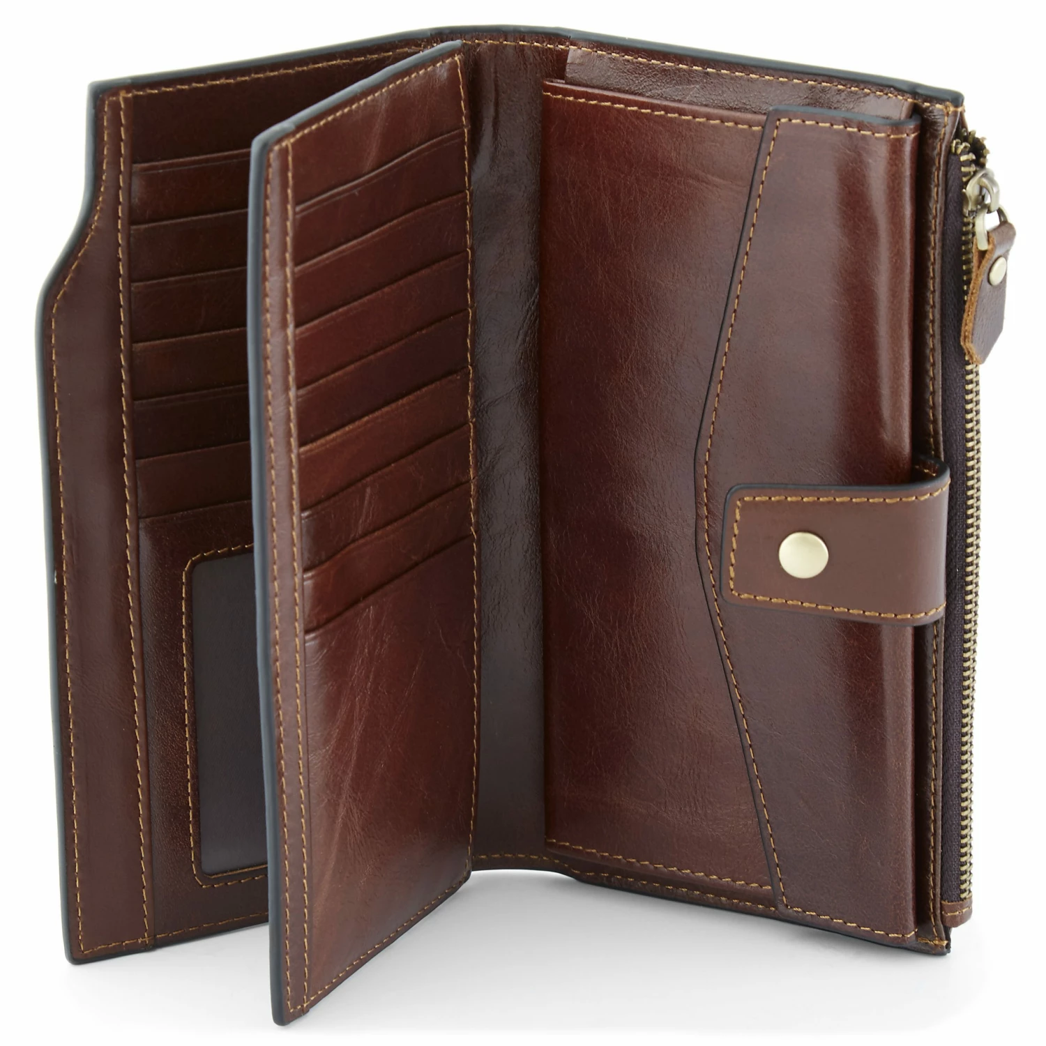 Protégez votre argent et vos cartes bancaires sans sacrifier le style. Ce portefeuille en cuir classique en cuir marron vintage est conçu pour empêcher le vol électronique.