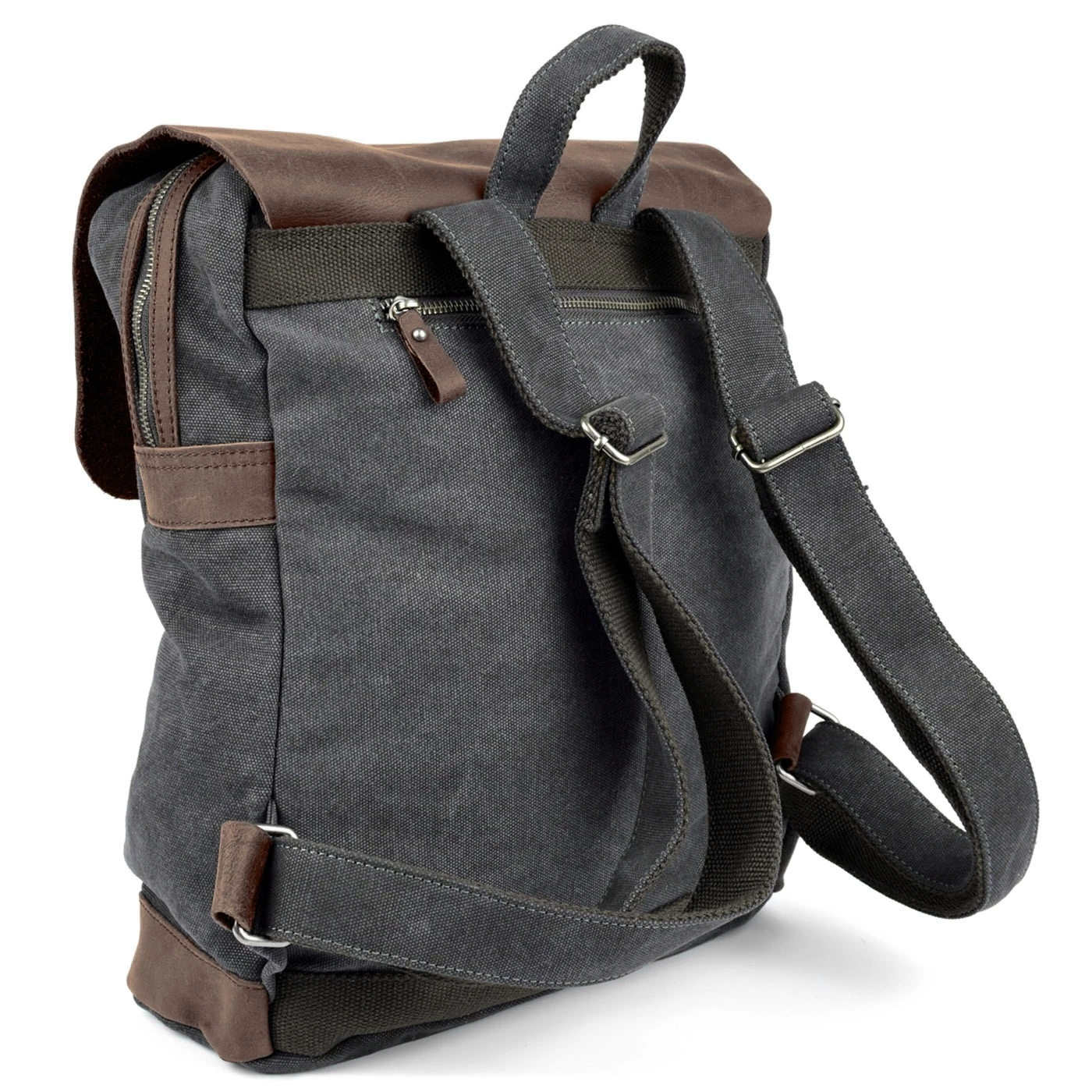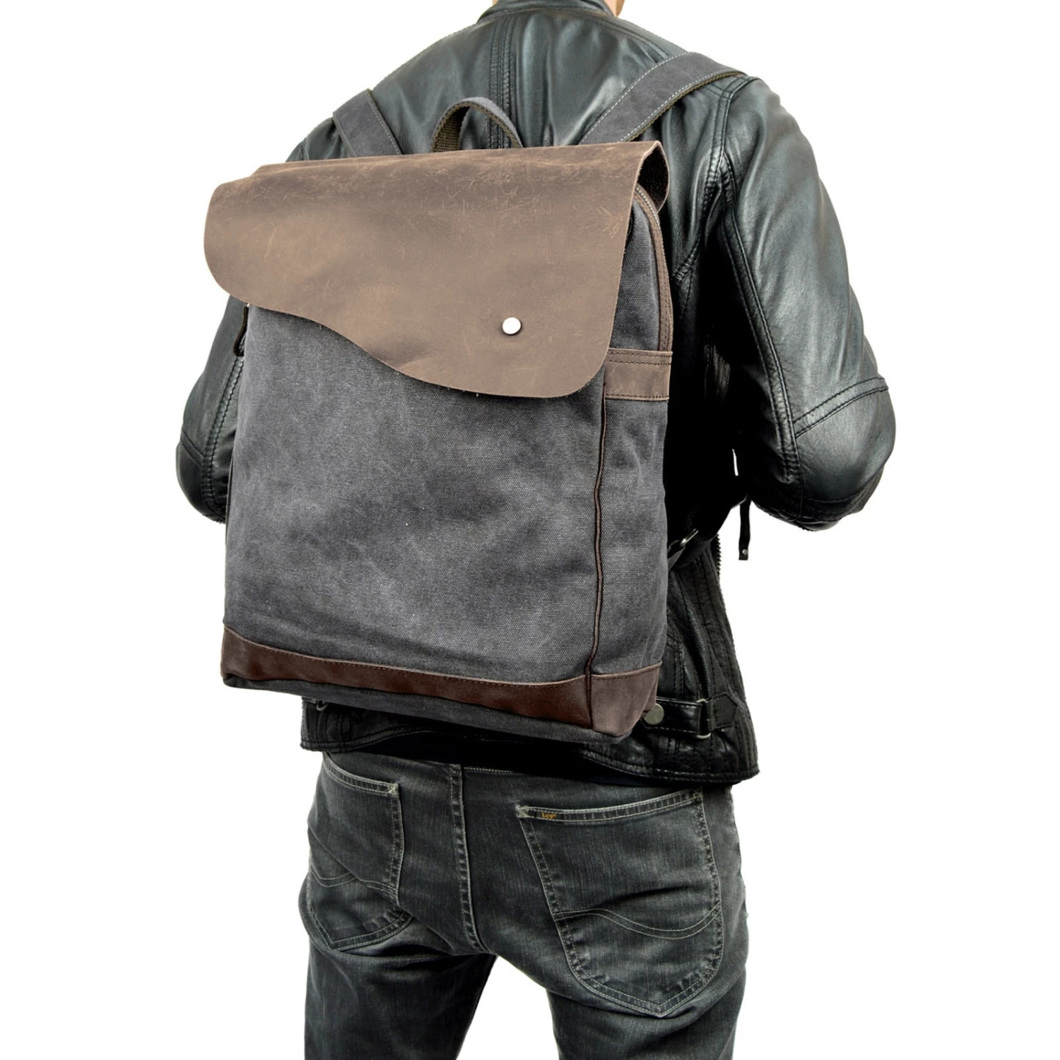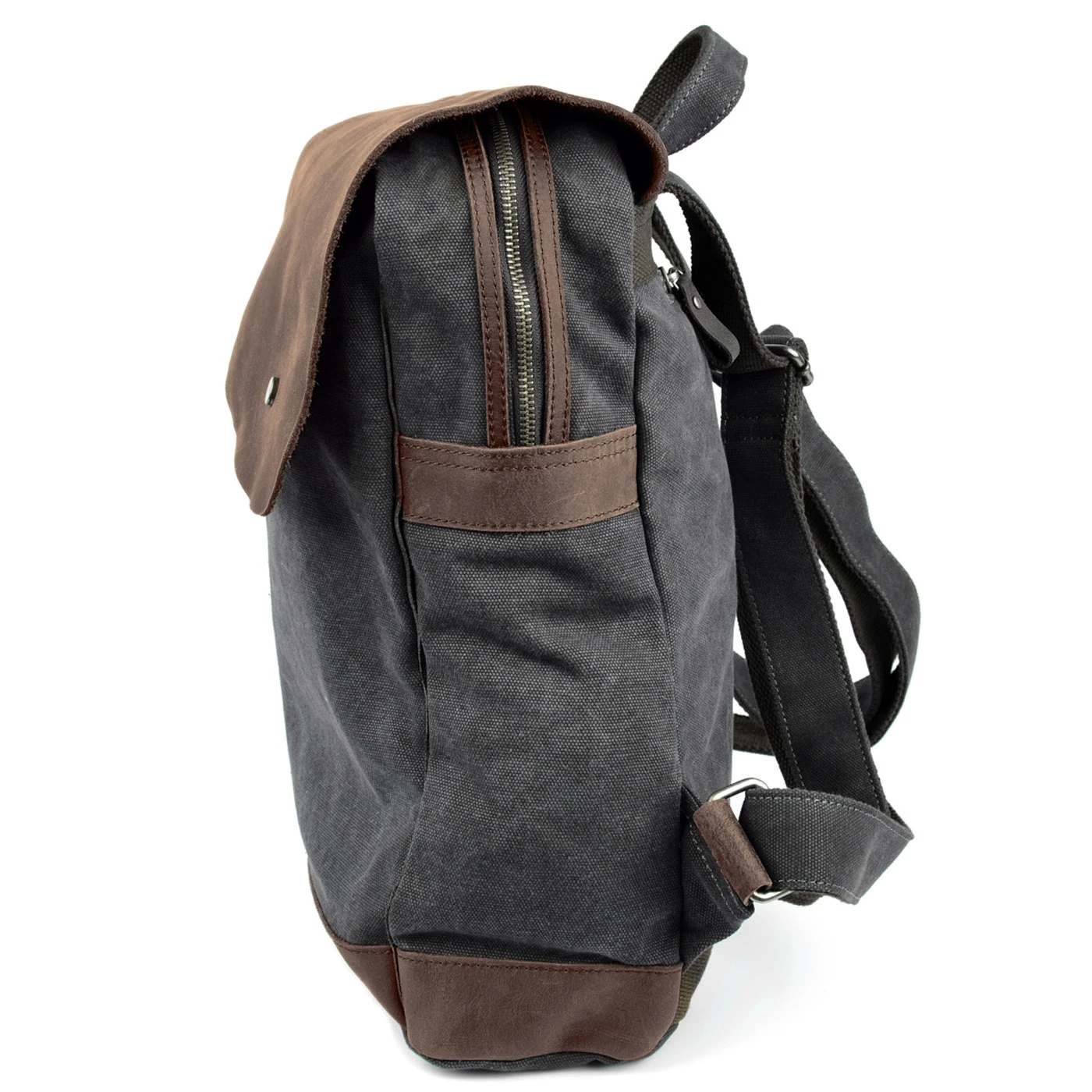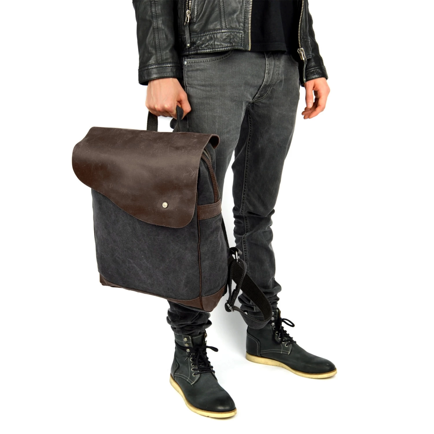 Un sac de Convey au look unique. Ce sac est fabriqué en toile gris foncé, très épaisse et résistante, procurant une sensation brute au toucher. Des finitions en véritable cuir brut tanné, de couleur marron foncé et ayant conservé les détails de pigmentation du cuir naturel viennent compléter cette toile grise de manière harmonieuse.
