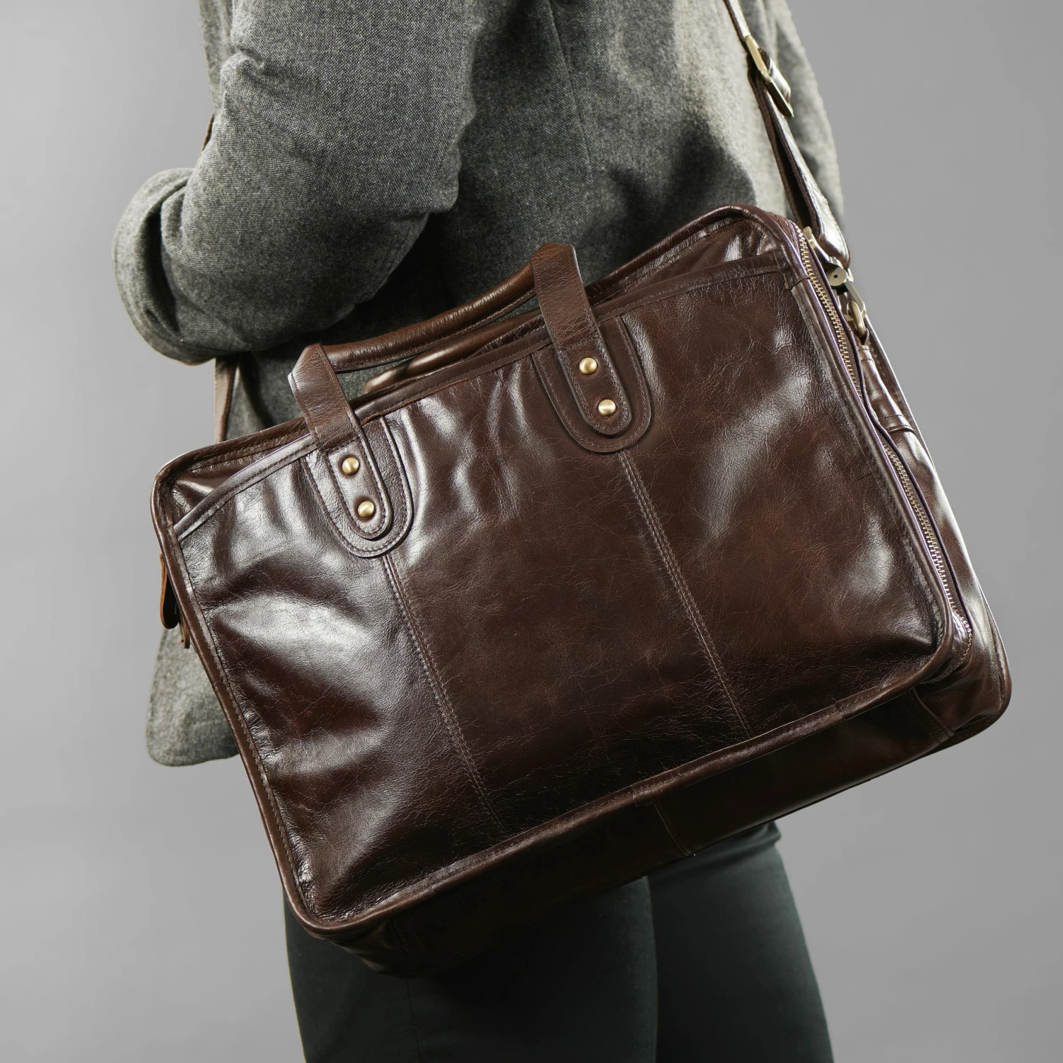 Ce porte-documents dispose de deux compartiments séparés. L’intérieur est entièrement doublé et offre de nombreux espaces de rangement. Les poches intérieures vous permettront de transporter tous vos objets du quotidien. En plus de vos documents vous pourrez y glisser ordinateur portable, tablette ou vêtements.