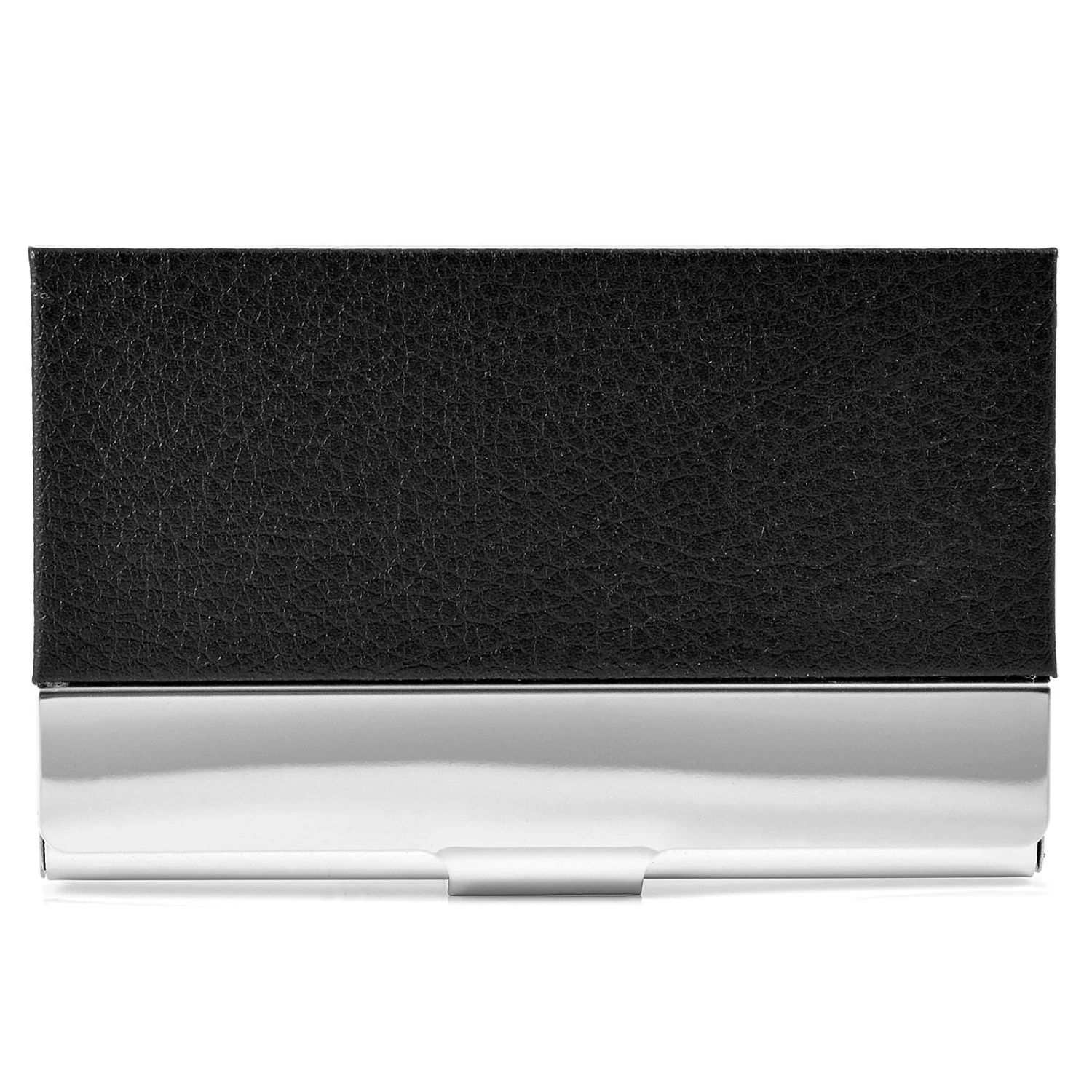 Un porte carte élégant et original en acier inoxydable recouvert de cuir noir et dont la surface intérieure a été doublée de tissu noir.