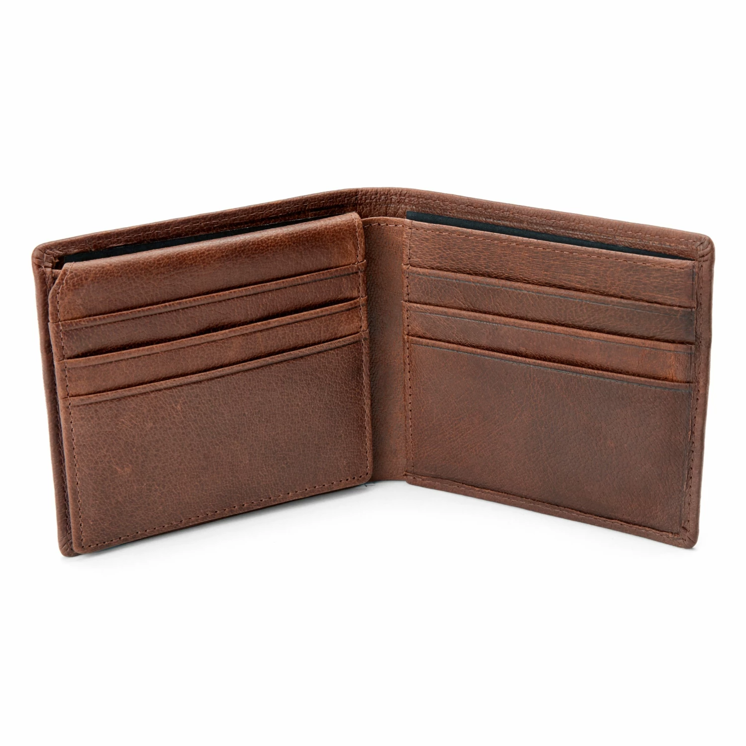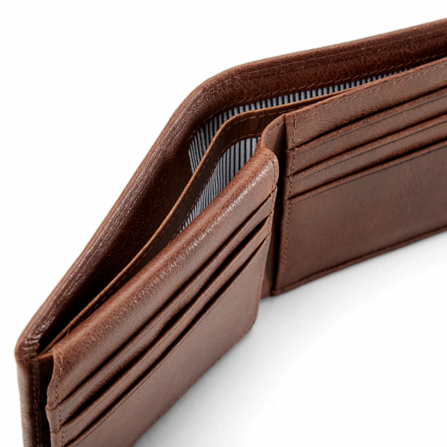 Idéal pour glisser dans votre poche arrière et sortir, ce portefeuille à deux volets est fabriqué à partir de cuir brun durable avec une finition légèrement texturée.