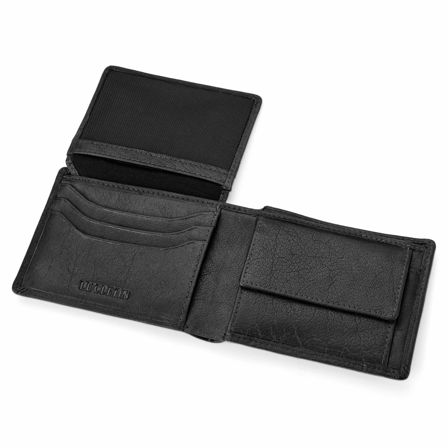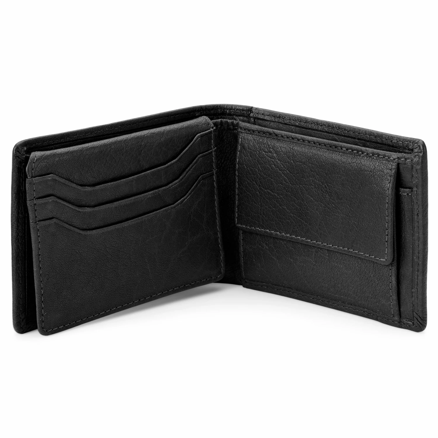À l’intérieur se trouvent six emplacements pour cartes chacune pouvant ranger deux cartes. Deux espaces pour vos billets de banque et vos papiers importants, ainsi qu’une petite poche à monnaie intégrée sont inclus. Le rabat pouvant contenir votre pièce d’identité ainsi que les deux pochettes supplémentaires complètent le design.