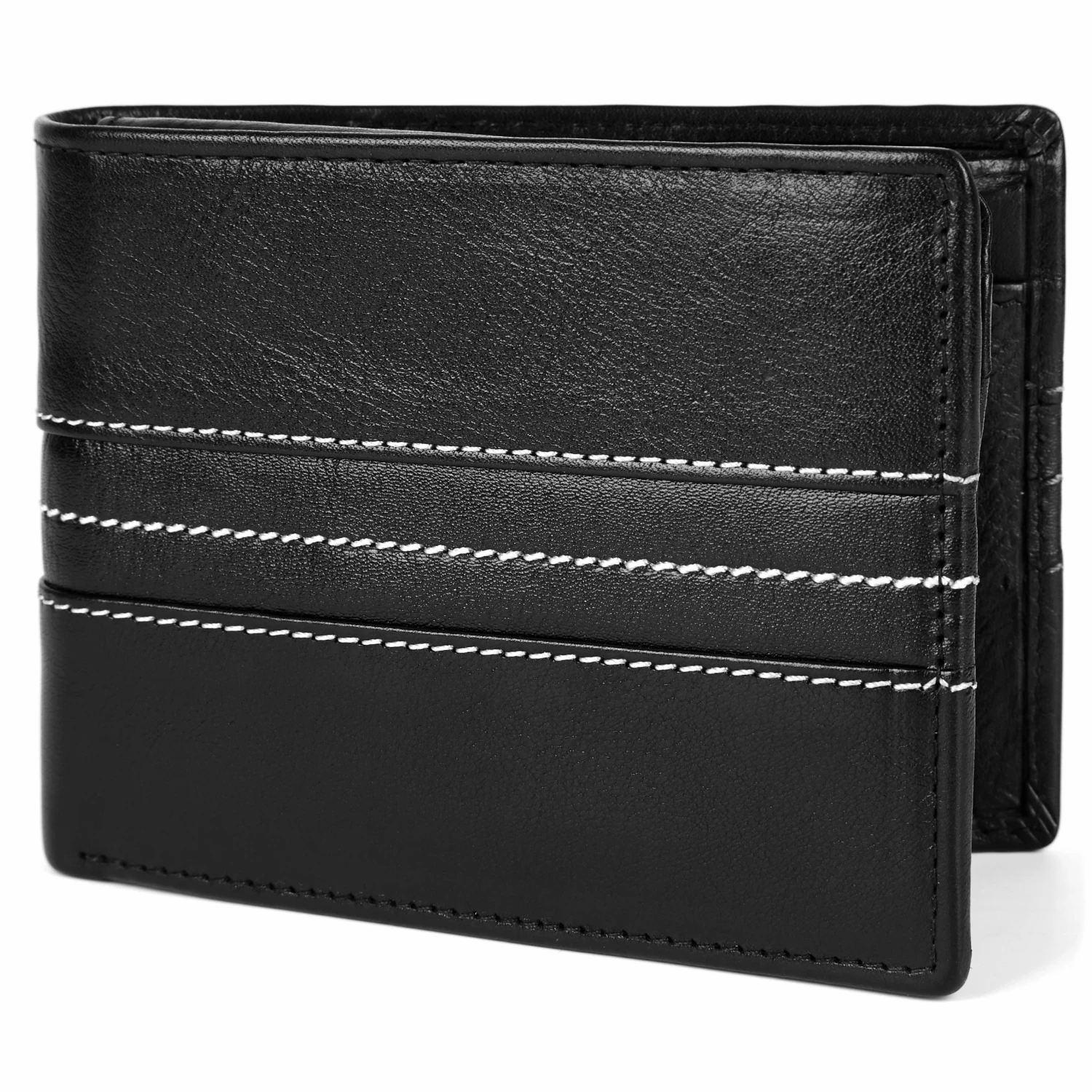 Ce splendide portefeuille en cuir de vachette est décoré de rayures surpiquées à la finition très soignée courant tout le long de sa surface extérieure.