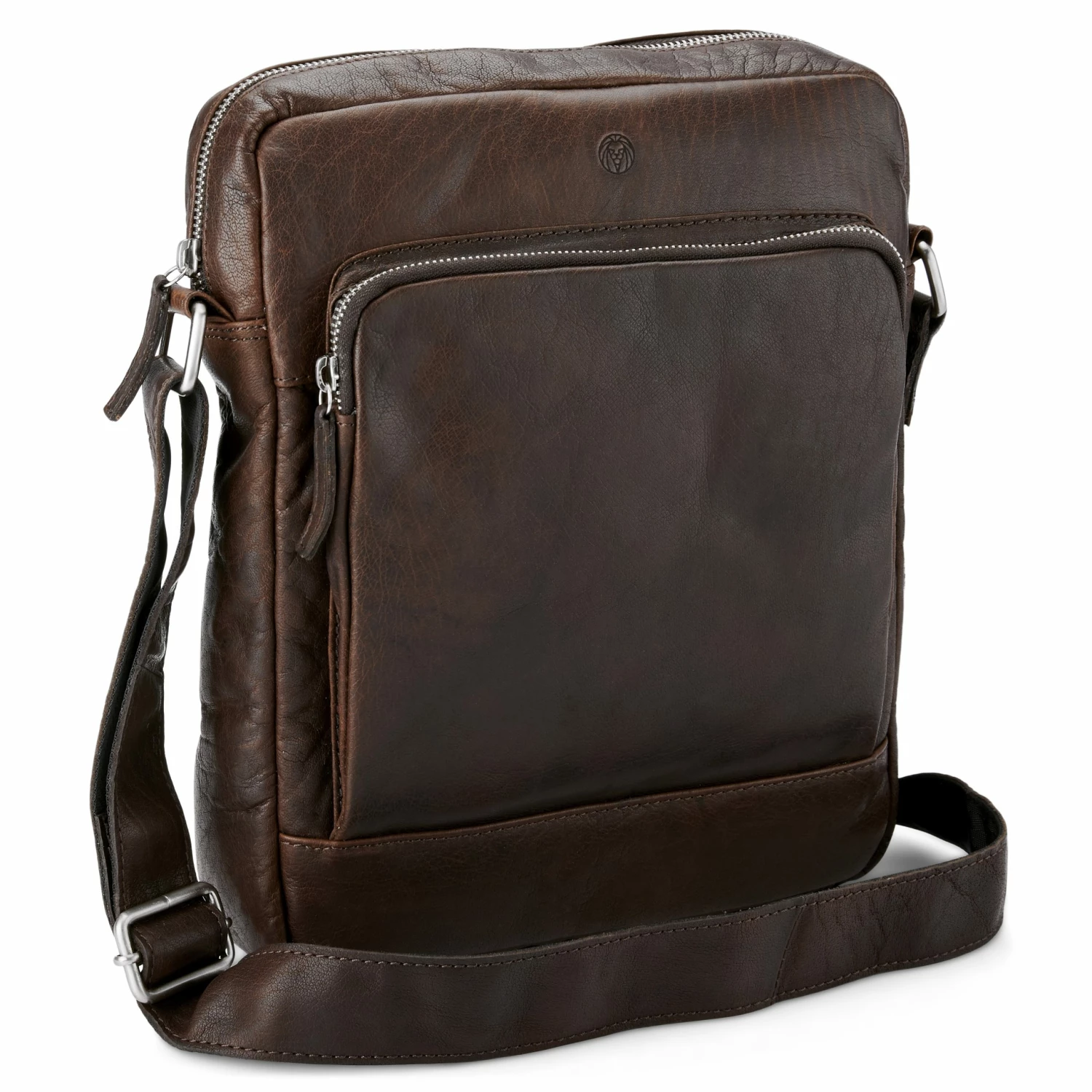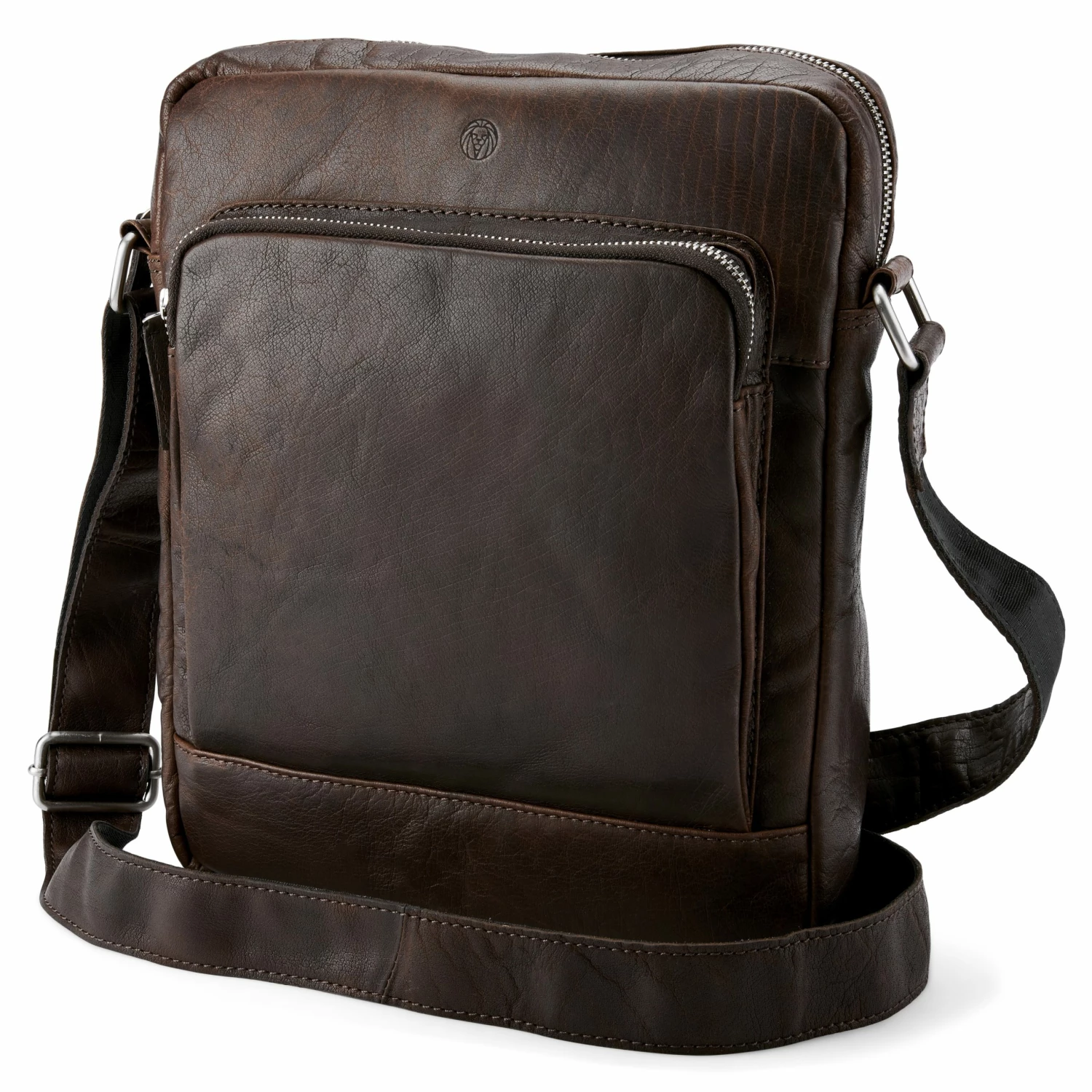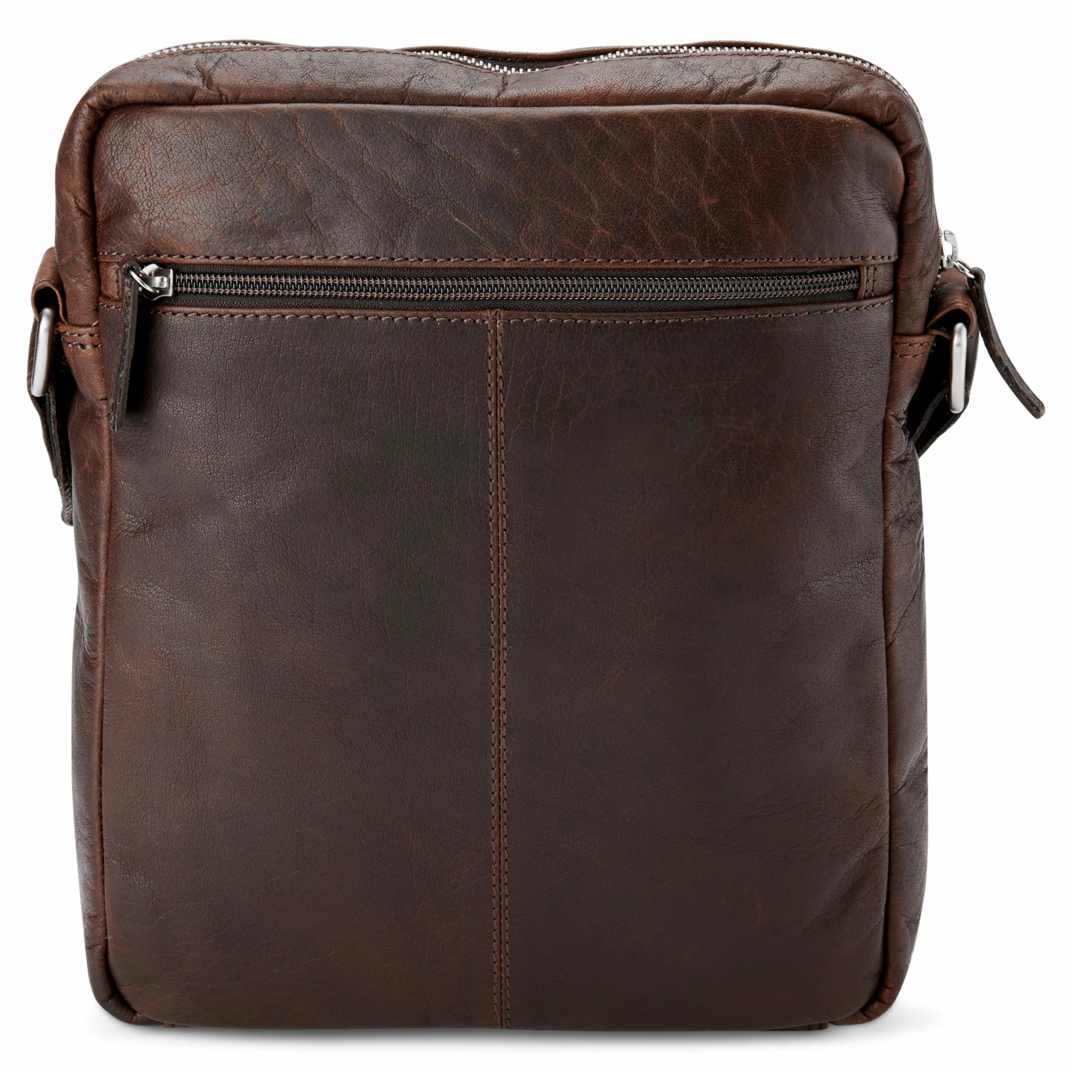 Le cuir brun rustique obtient une patine magnifique au fil du temps. Les fermetures éclair YKK robustes assurent une fermeture sécurisée pour vos biens. Une grande poche à fermeture éclair est incluse à l’avant et une plus petite à l’arrière. La bandoulière est facilement ajustable.