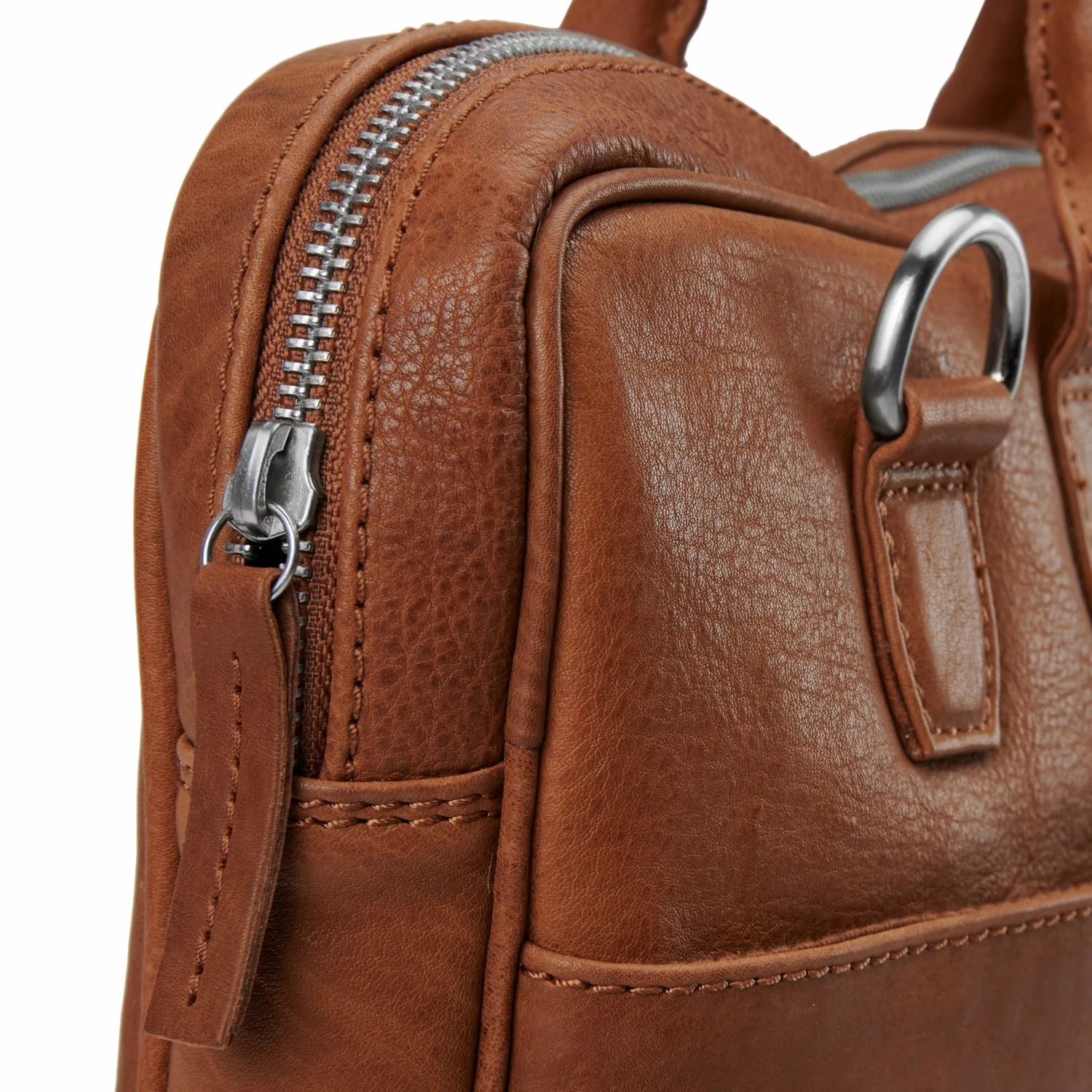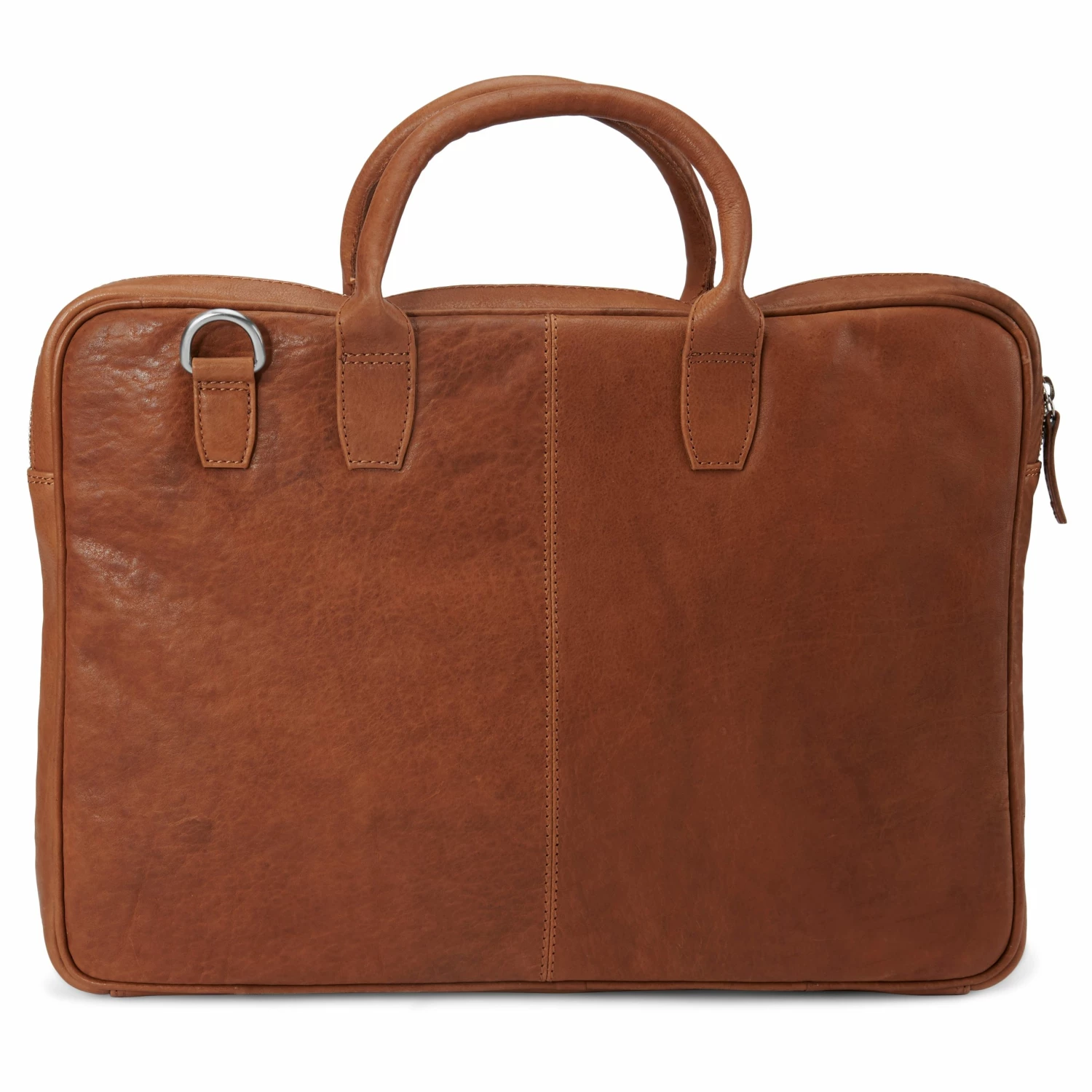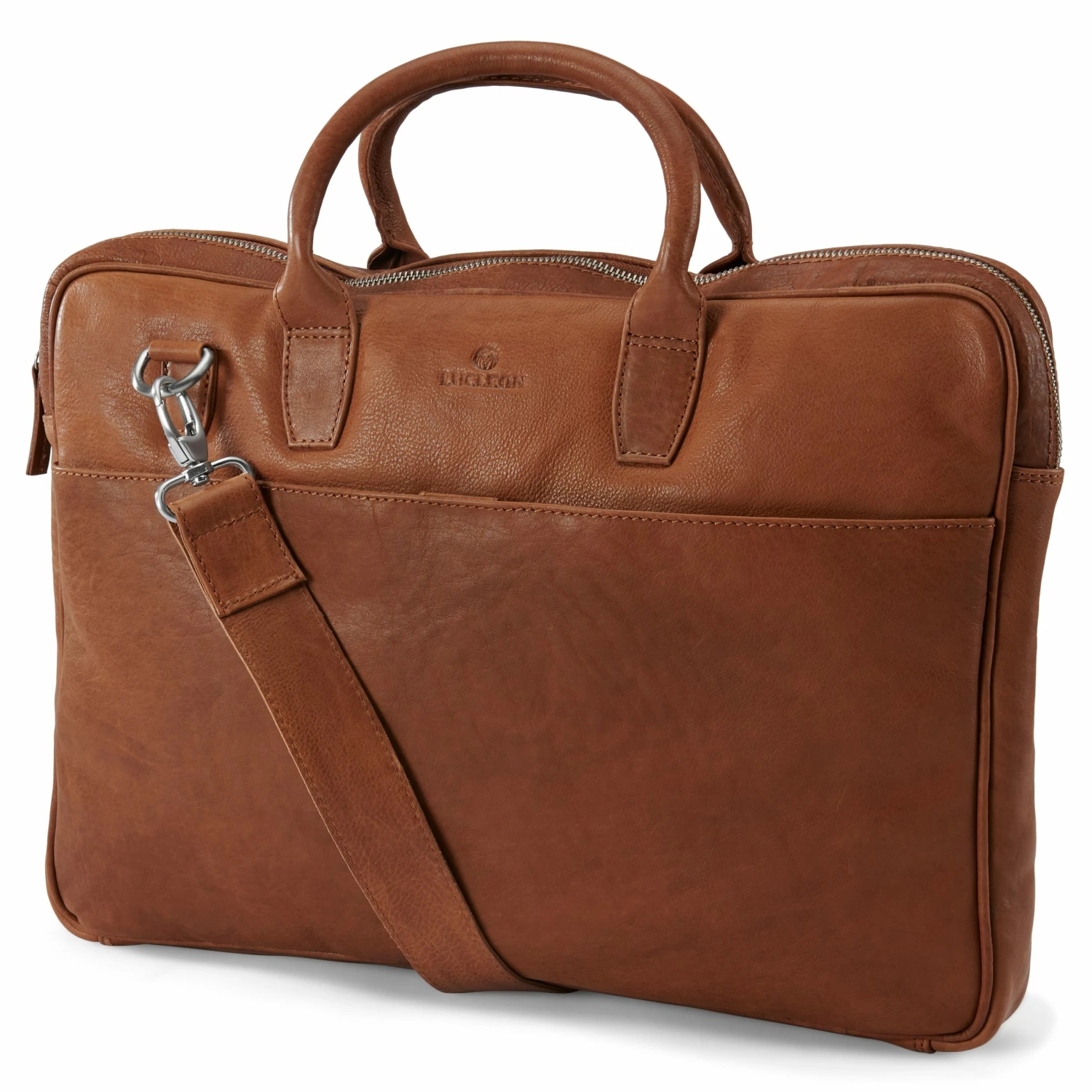 Ce sac en cuir brun clair / brun se distingue par son profil mince et son grand espace de rangement.