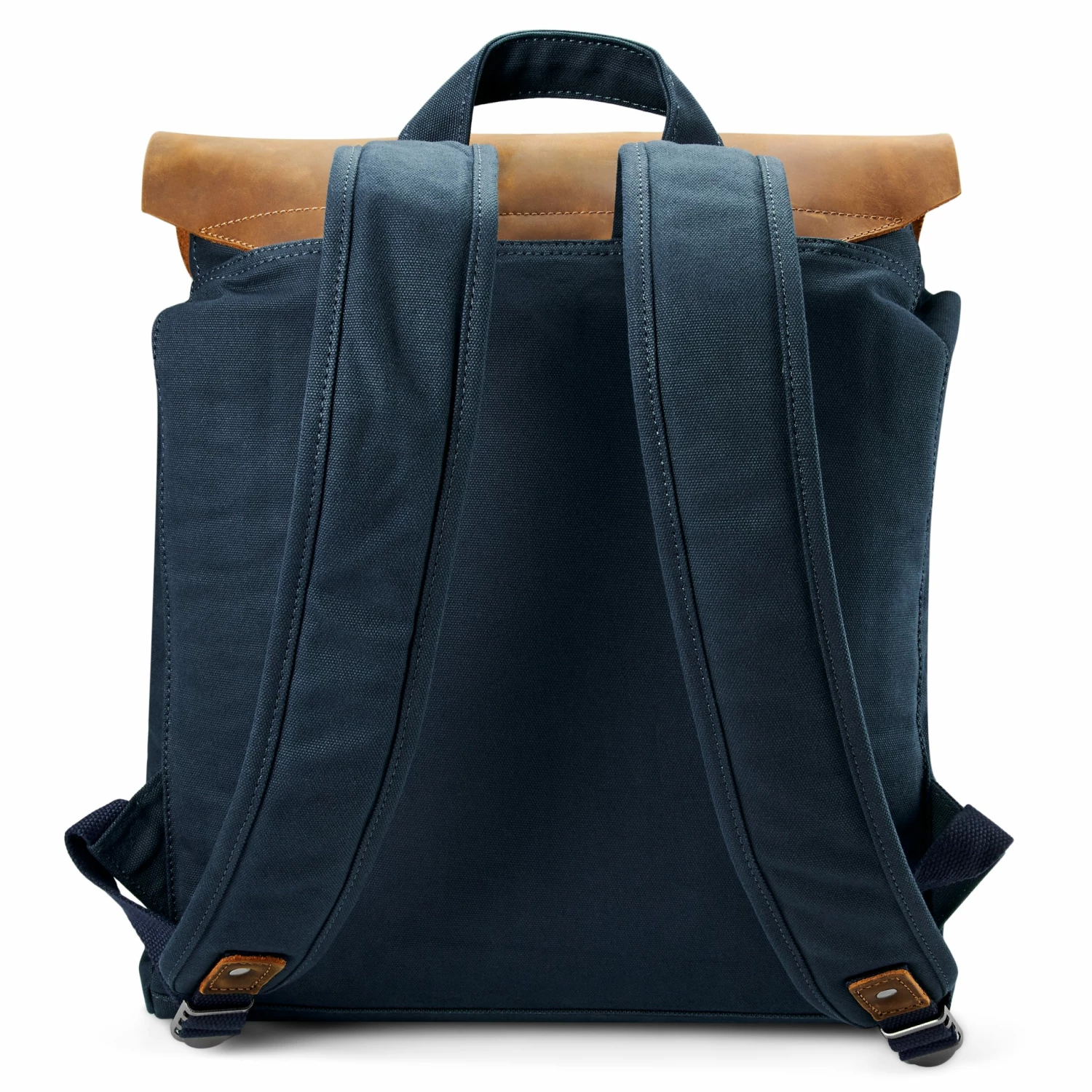 La toile de coton bleue résistante et les détails en cuir beige garantissent que ce sac à dos peut supporter tout ce que votre voyage vous réserve, alors que les bretelles réglables vous permettent de le manipuler avec confort.